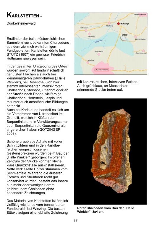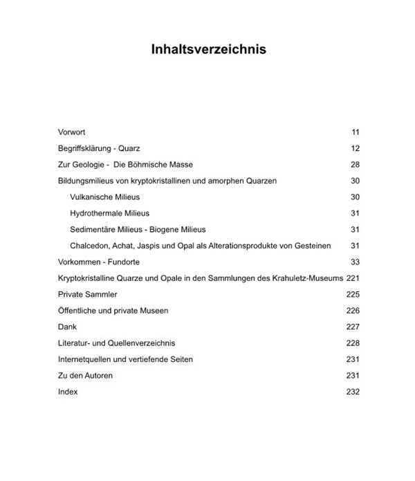 Die umfangreiche Publikation bietet erstmalig eine ausführliche Übersicht über die unerwartet zahlreichen und in Sammlerkreisen weitgehend unbekannten Vorkommen sowie die bemerkenswerte Vielfalt dieser farbenprächtigen niederösterreichischen Schmucksteine samt Infos zur Geologie, den Bildungsbedingungen und zur manchmal etwas komplexen Terminologie der kryptokristallinen und amorphen Quarze.