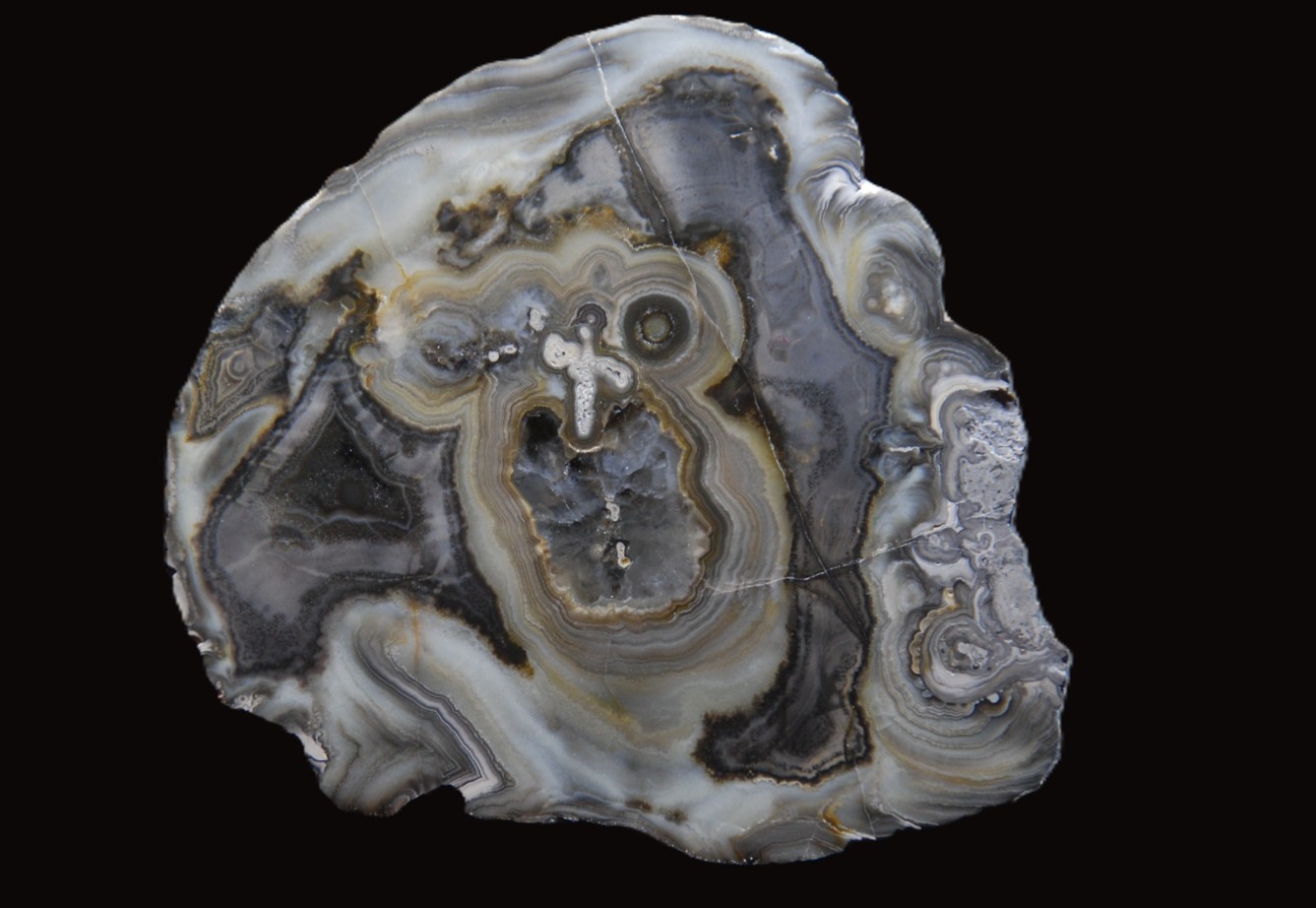 This unique agate was found by the late claim owner Gabriel “Gabe“ Olvera and subsequently acquired as a rough nodule by collector and dealer Mark Boche, Nebraska, USA. Hannes Holzmann bought the rough agate from Mark in 2012 and had it cut in March 2013 by the Dreher (Brunke) company in Fischbachtal near Idar-Oberstein, Germany. Master grinder Thorsten Jakob contributed the perfect finish.