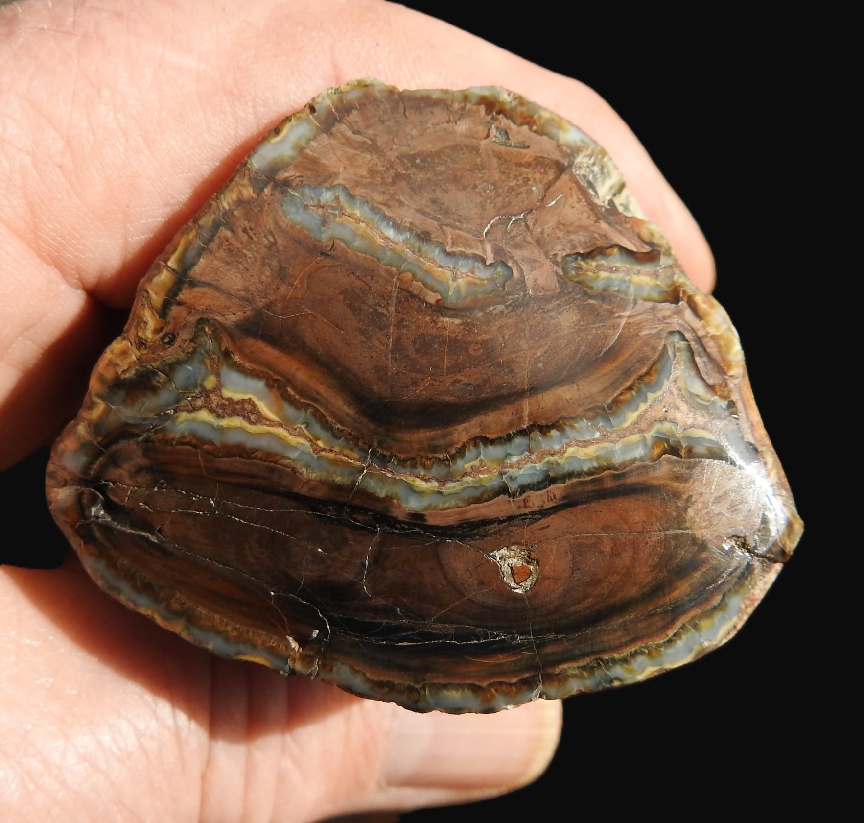 Der abgebildete Achat wurde erst im Jahr 2023 vom engagierten deutschen Sammler Andreas Fiedler seiner Sammlung hinzugefügt. Er besticht durch mindestens 8 verschiedene Farbschattierungen vorwiegend im Pastellbereich und eine extrem feine, kontrastreiche Bänderung, die den begehrten Kippeffekt (Schattenachat, "Wägeler") aufweist. Auch die Größe und die Rissfreiheit dieses Achates sind überaus bemerkenswert.