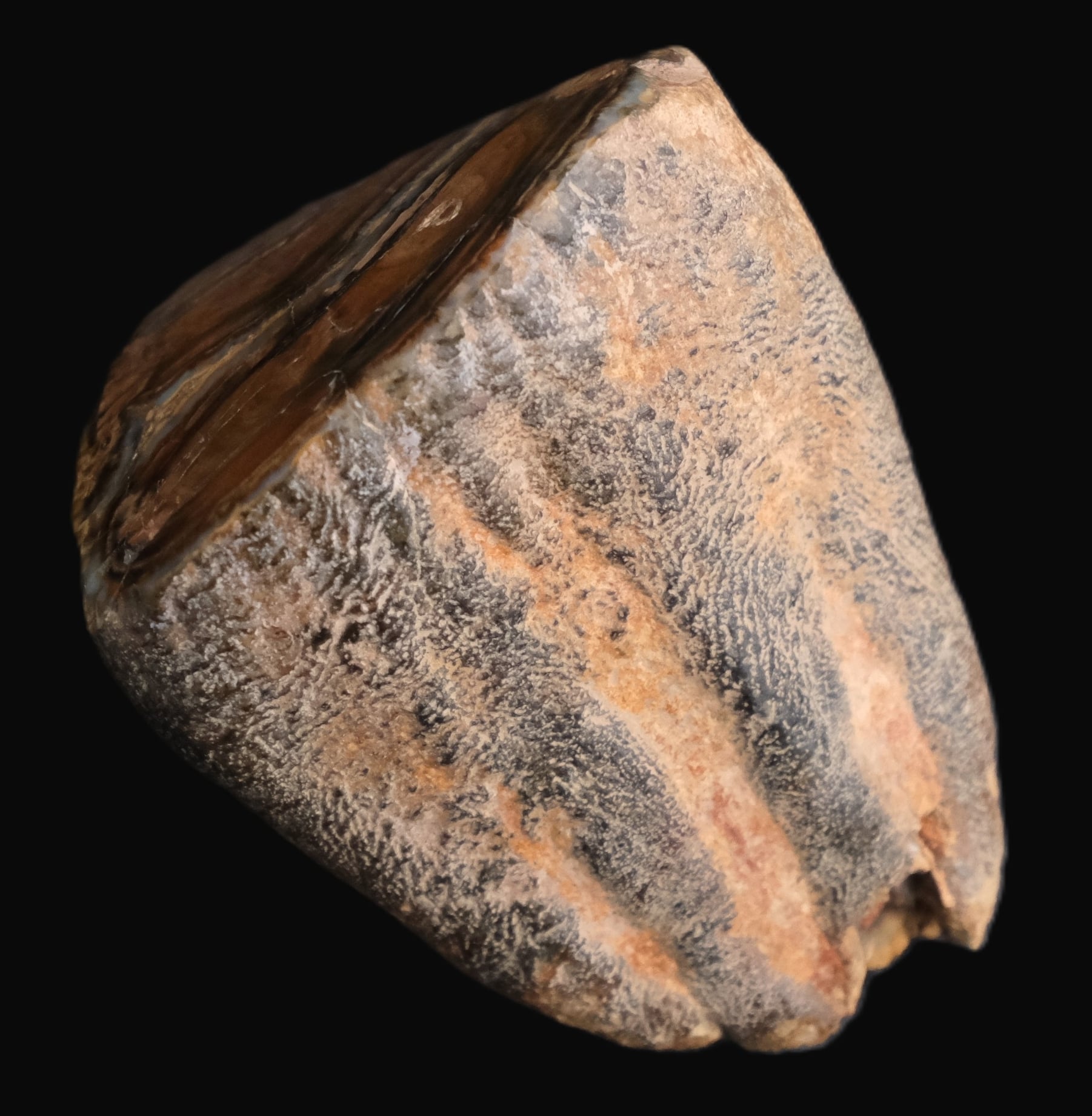 Silicified (agatized) bones and other formerly organic materials, such as snails or wood, are known from all over the world. A particularly interesting specimen on this topic is found in the collection of the German agate and jasper expert Günter Erkens. He has been collecting from the gravel pits of the Lower Rhine for many years and possesses one of the finest collections from this region. In addition to agates, jasper, and other minerals, various silicified materials also occur as great rarities. The most significant piece in the Erkens collection to date is likely the tooth pictured here, which probably originated from a Eurasian ancient elephant (wood elephant) (Palaeoloxodon antiquus). It measures 7x5.5x4.5 cm and was found by Günter Erkens’ wife in the former Goch gravel pit along the A 57 highway in North Rhine-Westphalia, Germany, in 2020. At least parts of this tooth appear to be silicified and even display agate-like, blue-yellow banding.